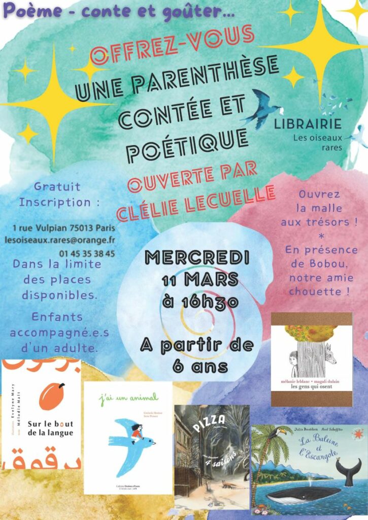 Inscription sur place, par mail (lesoiseaux.rares@orange.fr) ou par téléphone (01 45 35 38 45) ; dans la limite des places disponibles; Enfants accompagné.e.s d’un adulte.