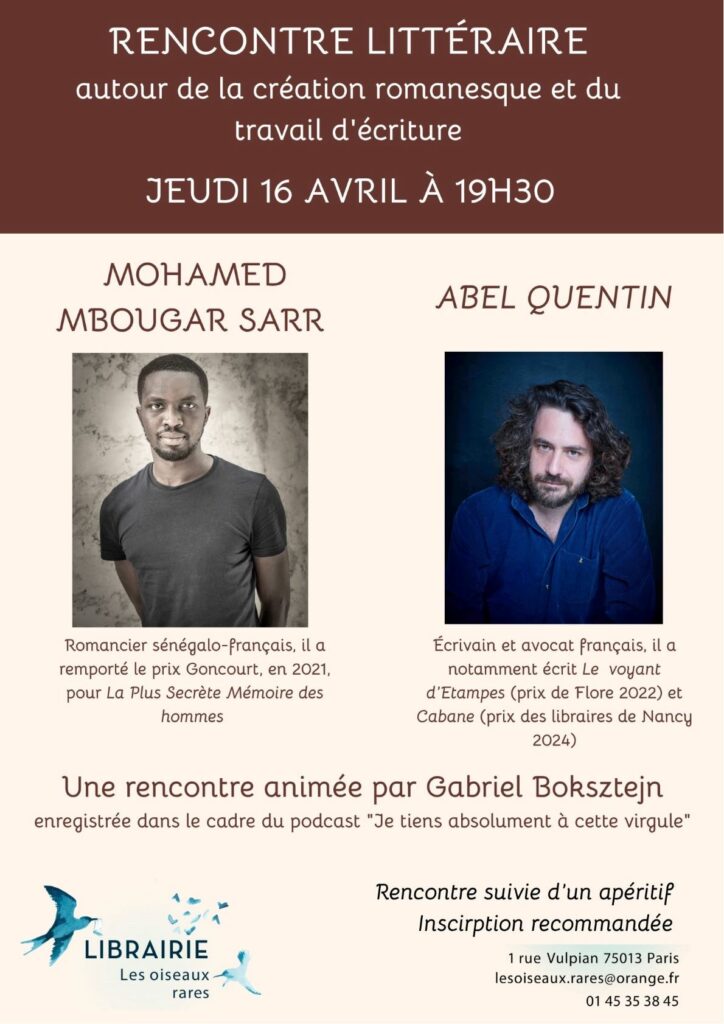La librairie a le plaisir d’accueillir Mohamed Mbougar Sarr et Abel Quentin, pour une rencontre littéraire organisée – et enregistrée – par Gabriel Boksztejn pour le Podcast « Je tiens beaucoup à cette virgule ».